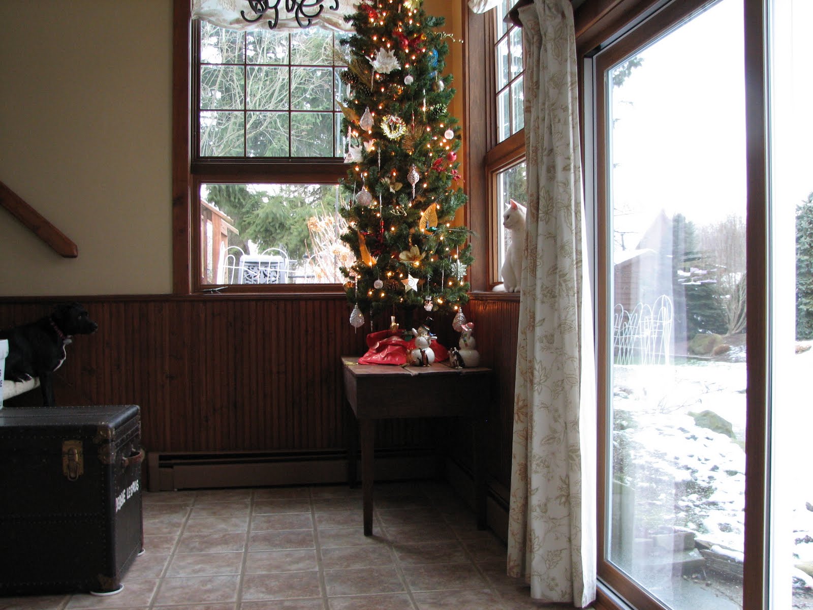 When Cosmo isn't admiring the tree, he's watching for birds and chipmunks outside. It's a very tall tree!